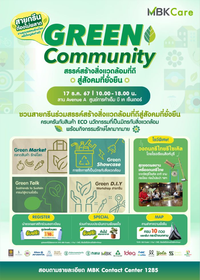 ขับเคลื่อนธุรกิจควบคู่การวางกลยุทธ์ที่เป็นมิตรต่อสิ่งแวดล้อมอย่างต่อเนื่อง สำหรับเอ็ม บี เค กับงาน “Green Community สรรค์สร้างสิ่งแวดล้อมที่ดีสู่สังคมที่ยั่งยืน” กิจกรรมดี ๆ ภายใต้ โครงการ MBK CARE ในวันอังคารที่ 17 ธันวาคม 2567 ณ ลานเอ็ม บี เค อเวนิว ศูนย์การค้าเอ็ม บี เค เซ็นเตอร์ หวังลดการปล่อยสารพิษหรือสารทำลายโอโซนในชั้นบรรยากาศ การผลิตจากวัสดุรีไซเคิลหรือสามารถนำกลับมาใช้ใหม่ได้ และการเลือกใช้วัตถุดิบจากธรรมชาติ ย่อยสลายเองได้ตามธรรมชาติ