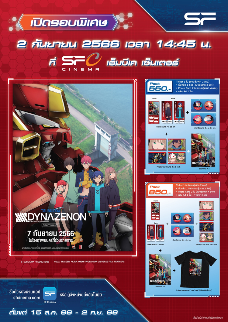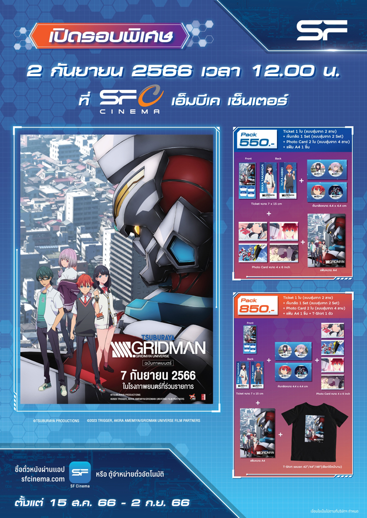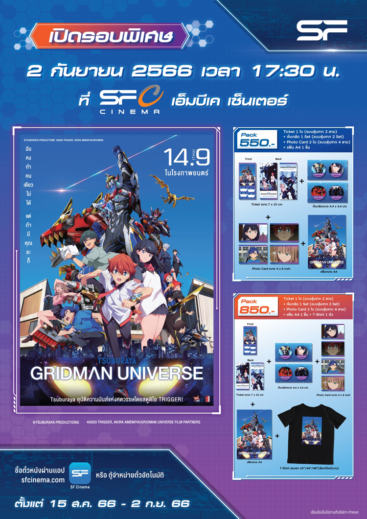 โรงภาพยนตร์ในเครือ เอส เอฟ เอาใจสาวกอนิเมะชุด “GRIDMAN” กับรอบพิเศษ 3 ภาค ในวันที่ 2 กันยายน 2566 ที่โรงภาพยนตร์ เอส เอฟ ซีเนม่า ศูนย์การค้าเอ็มบีเค เซ็นเตอร์ กับ “SSSS.GRIDMAN” รอบฉายเวลา 12.00 น., “SSSS.DYNAZENON” รอบฉายเวลา 14.45 น. และปิดท้ายที่ “GRIDMAN UNIVERSE” รอบฉายเวลา 17.30 น. และ 17.45 น.