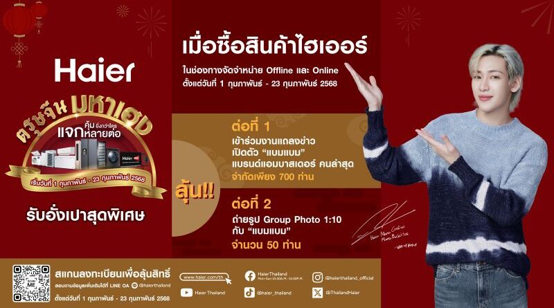 ไฮเออร์ (ประเทศไทย) ผู้นำด้านผลิตภัณฑ์และนวัตกรรมเครื่องใช้ไฟฟ้าระดับโลกและแบรนด์เครื่องใช้ไฟฟ้าอันดับ 1 ของโลกติดต่อกัน 16 ปีซ้อน เตรียมเสิร์ฟความสุขเอาใจเหล่าแฟนคลับดวงเฮง จัดแคมเปญพิเศษ “ตรุษจีนมหาเฮง…เอาใจคนรักแบมแบม” ชวนแฟน ๆ มาร่วมสร้างโมเมนต์สุดพิเศษร่วมกันในงานแถลงข่าวเปิดตัว Haier Brand Ambassador “แบมแบม” ในวันจันทร์ที่ 3 มี.ค. 2568 ณ ลาน Outdoor Square B-C ศูนย์การค้าเซ็นทรัลเวิลด์