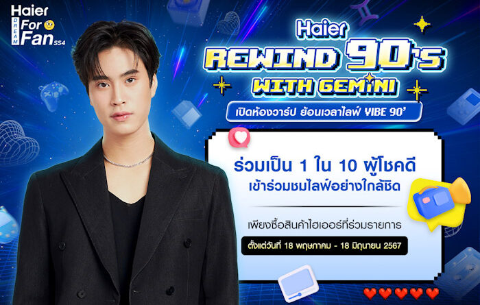 ไฮเออร์ (ประเทศไทย) ผู้นำด้านผลิตภัณฑ์และนวัตกรรมเครื่องใช้ไฟฟ้าระดับโลกและแบรนด์เครื่องใช้ไฟฟ้าอันดับ 1 ของโลกติดต่อกัน 15 ปีซ้อน ชวนเจาะเวลาย้อนวันวานไปสู่ยุค 90 อีกครั้ง จัดกิจกรรม Haier Dream For Fan Season 4 ตอน “Haier Rewind 90’s With Gemini เปิดห้องวาร์ป ย้อนเวลาไลฟ์ Vibe 90” ไปกับหนุ่มฮอตสุดละมุน “เจมีไนน์ นรวิชญ์ ฐิติเจริญรักษ์” ที่พร้อมพาทุกคนผจญภัยในห้วงมิติแห่งกาลเวลาที่รับประกันความบันเทิงครบรส พร้อมลุ้นเป็น 10 ผู้โชคดีที่จะได้เข้าร่วมชมไลฟ์และทำกิจกรรมแสนสนุกในสไตล์ของคน Gen Y ร่วมกับ เจมีไนน์ นรวิชญ์