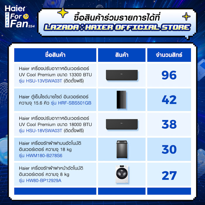 6. ประกาศรายชื่อผู้โชคดี จำนวน 10 ท่าน ในวันที่ 20 มิ.ย. 2567 เวลา 18.00 น. ผ่านทาง Facebook : Haier Thailand
