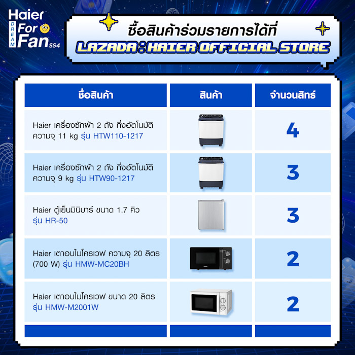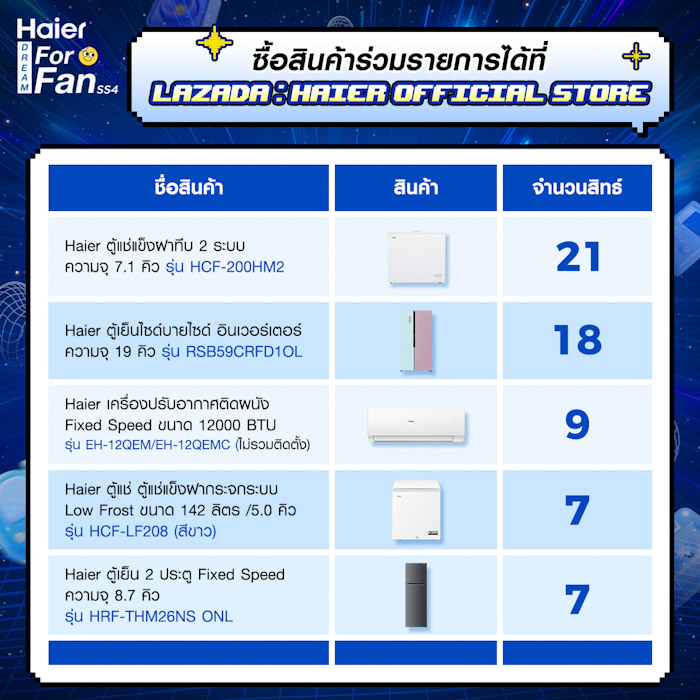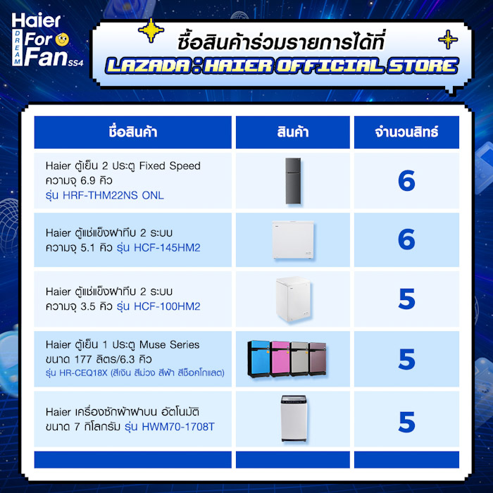 2. ซื้อสินค้าไฮเออร์ที่ร่วมรายการเพื่อสะสมสิทธิ์ Lucky Draw ผ่านช่องทาง Lazada Haier Official Store : https://www.lazada.co.th/shop/haier