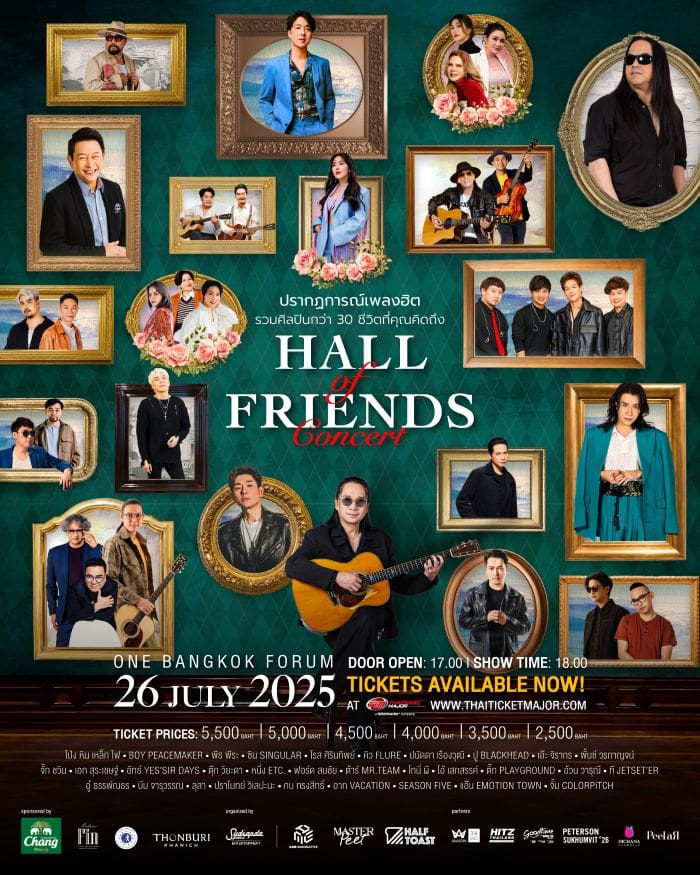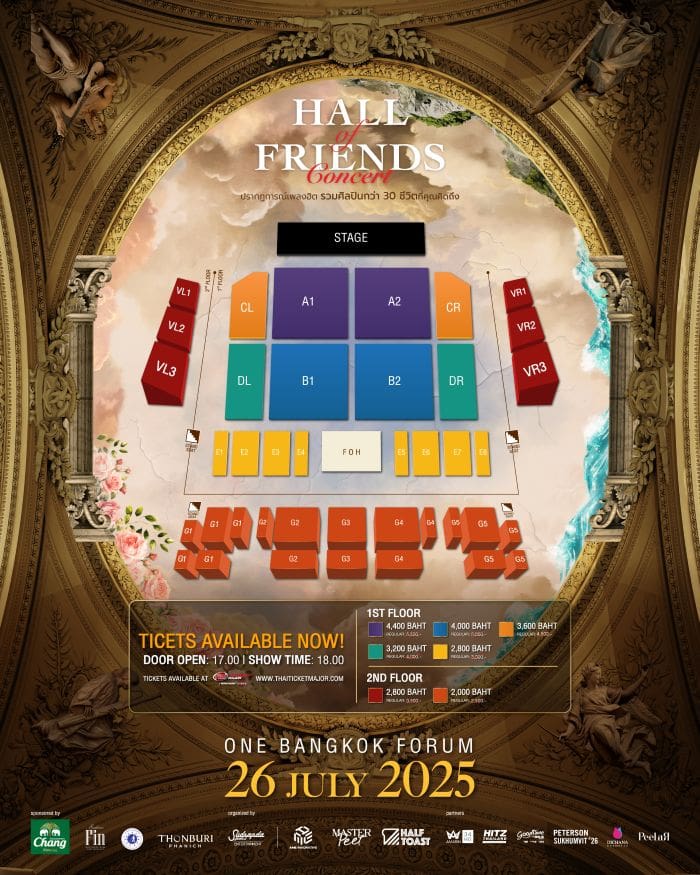 แฟนๆ ห้ามพลาด! ร่วมเป็นส่วนหนึ่งกับค่ำคืนสุดพิเศษใน ‘Hall of Friends Concert’ วันเสาร์ที่ 26 กรกฎาคม 2568 นี้ ณ One Bangkok Forum ซื้อบัตรได้แล้ววันนี้ ทาง Thaiticketmajor บัตรราคา 5,500 / 5,000 / 4,500 / 4,000 / 3,500 / 2,500 บาท