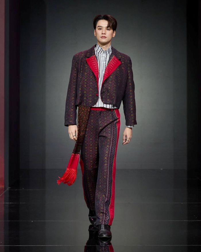 ในวันเปิดงาน ‘เก่ง- หฤษฎ์ บัวย้อย’ จากซีรีย์สที่มีความเป็นไทยสร้างสรรค์อย่างเต็มเปี่ยมอย่าง เขมจิราต้องรอด มาร่วมสะท้อนมุมมองที่มีต่อศิลปวัฒนธรรม ก่อเกิดผลงานที่เต็มไปด้วยเรื่องราวที่เต็มไปด้วยกลิ่นอายของจิตวิญญาณท้องถิ่น ผ่าน “ผ้าซิ่นตีนแดง” ซึ่งเป็นผ้าไหมทอมือเอกลักษณ์ท้องถิ่นของจังหวัดบุรีรัมย์ โดยลักษณะผ้าไหมจะเป็นมัดหมี่ลายพื้นเมือง ลวดลาย ‘ฟันเลื่อย’ และ ‘ขอ’ ที่นำมาตีความใหม่แบบร่วมสมัย การเลือกใช้โทนสีแดงอันเป็นเอกลักษณ์ของลวดลายผ้ามาตกแต่งบริเวณชายเสื้อเพื่อเพิ่มมิติและความน่าสนใจ ในโชว์เปิดรันเวย์