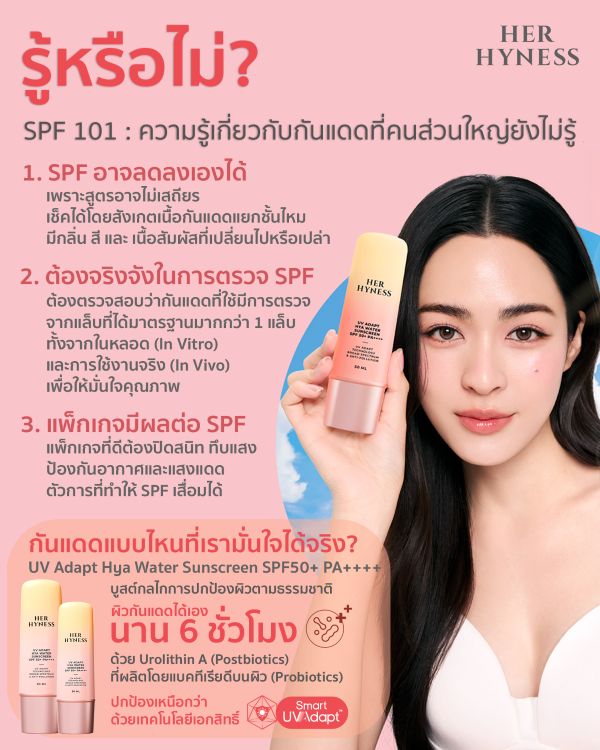 HER HYNESS (เฮอ ไฮเนส) แบรนด์ผลิตภัณฑ์คลีนบิวตี้มาตรฐานระดับโลกฝีมือคนไทยที่ทำยอดขายพันล้านในเวลาเพียง 8 ปี ประกาศเปิดตัวนวัตกรรมกันแดด “UV Adapt Hya Water Sunscreen SPF50+ PA++++” ที่มาพร้อมเทคโนโลยีเอกสิทธิ์ Smart UV Adapt™ พัฒนามาเพื่อตอบโจทย์ไลฟ์สไตล์ผู้บริโภคที่ต้องเผชิญแดดในการใช้ชีวิต และแก้ pain point ของกันแดดทั่วไปที่ควรทาซ้ำทุกๆ 2 ชั่วโมง ด้วยจุดเด่น “ให้ผิวกันแดดได้เองตามธรรมชาติยาวนานถึง 6 ชั่วโมง” และยังช่วยฟื้นฟูกลไกผิวให้แข็งแรงอย่างยั่งยืนจากภายใน
