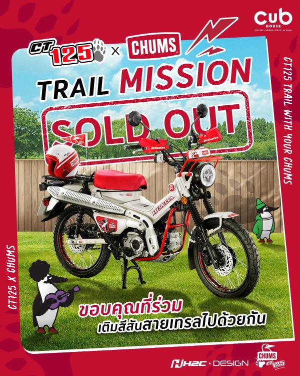 หลังจากที่ไทยฮอนด้าเปิดตัวรถจักรยานยนต์รุ่นใหม่ ‘New Honda CT125 CHUMS Limited Edition’ โมเดลคัสตอมพิเศษจาก CUB House ภายในงาน Big Motor Sale 2025 ด้วยดีไซน์โดดเด่นที่มาพลิกโฉมโลกแห่งการผจญภัย ถ่ายทอดความสดใส มีชีวิตชีวา รวมถึงเป็นการโคจรมาพบกับ ‘CHUMS’ แบรนด์แฟชั่นเอาท์ดอร์สุดชิคจากประเทศญี่ปุ่นเป็นครั้งแรก ทำให้ได้รับกระแสตอบรับถล่มทลาย โดยสามารถปิดการขายได้ครบจำนวนจำกัด 300 คัน ภายในเวลาเพียง 10 วัน สะท้อนให้เห็นถึงความนิยมและความต้องการของลูกค้าที่หลงใหลในรถสไตล์เทรลลุคใหม่ ทั้งนี้ ไทยฮอนด้าขอขอบคุณลูกค้าทุกท่านที่ให้ความไว้วางใจและเชื่อมั่นในแบรนด์ ความสำเร็จในครั้งนี้ถือเป็นอีกก้าวสำคัญที่สะท้อนถึงความแข็งแกร่งของไทยฮอนด้า และตอกย้ำความเป็นผู้นำตลาดรถจักรยานยนต์ไทย