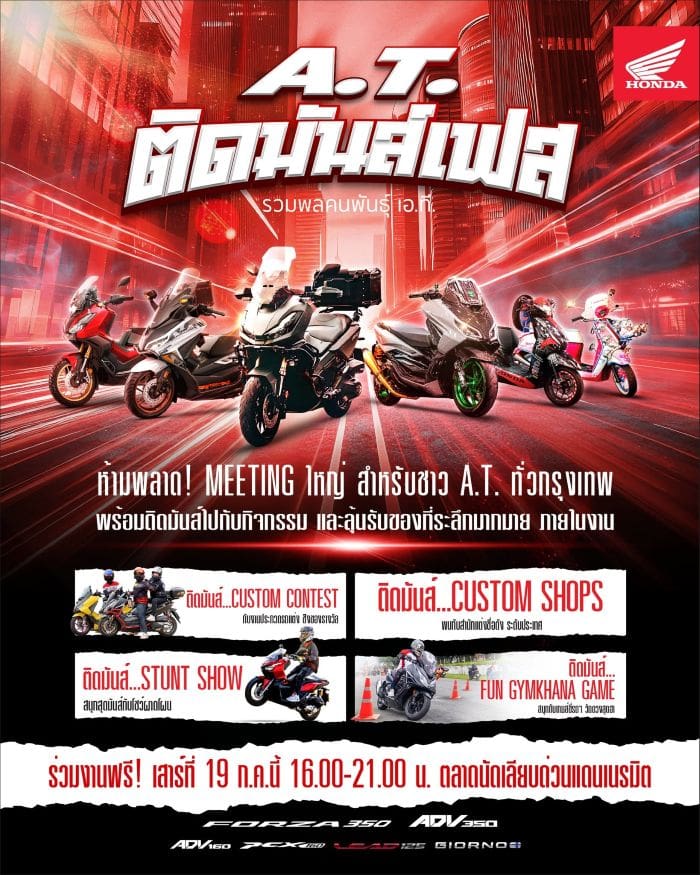 รถจักรยานยนต์ฮอนด้า ชวนชาว A.T. มามีตติ้งครั้งใหญ่กันในงาน “A.T. ติดมันส์เฟส” วันที่ 19 ก.ค. 68 ณ ตลาดนัดเลียบด่วนแดนเนรมิต กรุงเทพฯ
