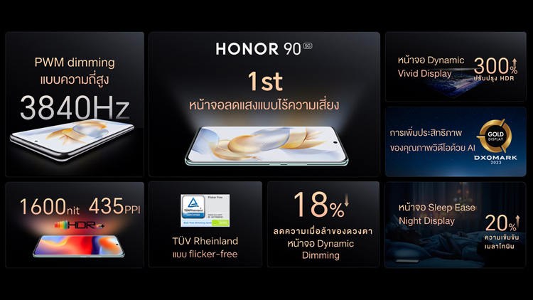 ผู้ใช้งานในยุคปัจจุบันจำเป็นต้องสัมผัสกับแสงสีฟ้าเป็นระยะเวลานาน จึงมักเกิดปัญหาทางสุขภาพดวงตาที่เมื่อยล้าจากการทำงานหนัก รวมถึงยังอาจก่อให้เกิดการเปลี่ยนแปลงของความดันโลหิตหรืออัตราการเต้นของหัวใจ ดังนั้น HONOR 90 5G จึงมาพร้อม PWM Dimming 3840Hz เทคโนโลยีช่วยถนอมสายตาที่มีประสิทธิภาพสูงสุดในตลาดสมาร์ทโฟนระดับเดียวกันในชั่วโมงนี้ พร้อมการรับรองโดย TÜV Rheinland Flicker Free ที่การันตีประสิทธิภาพการลดอัตราการกะพริบและลดแสงของหน้าจอ ทำให้สายตาไม่เมื่อยล้าจากการใช้งานอย่างต่อเนื่อง สะท้อนนวัตกรรม Human-centric ที่ออกแบบให้ผู้ใช้งานเป็นศูนย์กลาง อีกทั้งยังมีเทคโนโลยี Dynamic Dimming ที่เลียนแสงของหน้าจอให้ใกล้เคียงกับธรรมชาติ พร้อมปรับลดแสงอัตโนมัติโดยคำนึงจากความเหมาะสมกับสายตาและระยะเวลาในการใช้งาน และเทคโนโลยีที่ช่วยลดแสงสีฟ้าอัตโนมัติในเวลากลางคืนอย่าง Circadian night display เพื่อเพิ่มการหลั่งสารเมลาโทนินถึง 20% และเพิ่มประสิทธิภาพการนอนหลับ