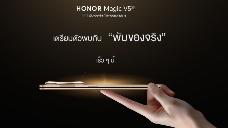 ออเนอร์ (HONOR) ผู้ให้บริการอุปกรณ์อัจฉริยะชั้นนำระดับโลก เตรียมเปิดตัว HONOR Magic V5 สมาร์ตโฟนจอพับระดับไฮเอนด์รุ่นล่าสุดในประเทศไทยอย่างเป็นทางการ ภายใต้คอนเซปต์ ‘พับของจริง ที่สุดของความบาง – Slimmest with No Compromise’ ชูจุดเด่น “บางที่สุดในโลก” ด้วยตัวเครื่องบางเพียง 8.8 มิลลิเมตร ขณะพับหน้าจอ ช่วยให้ผู้ใช้พกพาสะดวกคล่องตัว