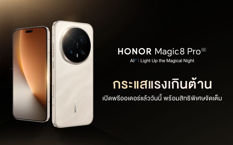 ออเนอร์ (HONOR) ผู้ให้บริการอุปกรณ์อัจฉริยะชั้นนำระดับโลก ประกาศความสำเร็จครั้งสำคัญของ HONOR Magic8 Pro สมาร์ตโฟนเรือธงรุ่นล่าสุด ที่สร้างปรากฏการณ์ความฮอตฮิตติดลมบนทันทีที่เปิดตัว โดยได้รับกระแสตอบรับอย่างล้นหลามจากผู้ใช้งานทั่วประเทศ และมียอดสั่งจองเข้ามาอย่างต่อเนื่อง สะท้อนให้เห็นถึงความเชื่อมั่นของผู้บริโภคที่มีต่อแบรนด์ และความต้องการสัมผัสประสบการณ์นวัตกรรมสมาร์ตโฟนระดับพรีเมียมที่ตอบโจทย์ทุกไลฟ์สไตล์