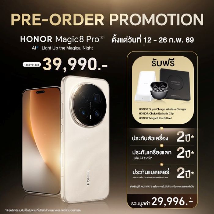 สิทธิพิเศษสำหรับลูกค้า Walk-in ที่ซื้อ HONOR Magic8 Pro ตั้งแต่วันที่ 27 กุมภาพันธ์ – 31 มีนาคม 2569 จะได้รับของสมนาคุณสุดพิเศษ DJI Osmo มูลค่า 2,560 บาท และ HONOR Magic8 Pro Giftset พร้อมรับประกันตัวเครื่องและแบตเตอรี่ตามมาตรฐานเดียวกับการสั่งจองล่วงหน้า (ของแถมมีจำนวนจำกัด)
