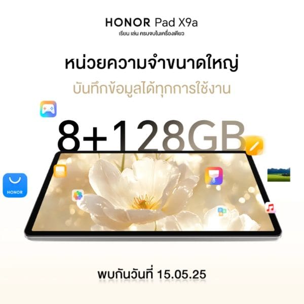 ออเนอร์ (HONOR) ผู้นำด้านอุปกรณ์อัจฉริยะระดับโลก เตรียมเปิดตัว HONOR Pad X9a แท็บเล็ตรุ่นใหม่ล่าสุดที่รองรับการใช้งานเทียบเท่าระดับ PC ตอบโจทย์การใช้งานทั้งการทำงานและความบันเทิง โดยจุดเด่นของรุ่นนี้คือการรองรับ HONOR Choice Pencil ปากกาอัจฉริยะที่ช่วยยกระดับประสบการณ์การจด เขียน หรือวาดภาพได้อย่างลื่นไหลและแม่นยำ พร้อมหน้าจอขนาดใหญ่ 11.5 นิ้ว ความละเอียดระดับ 2.5K และอัตราการรีเฟรช 120Hz ที่รองรับการถนอมสายตา เหมาะสำหรับการใช้งานต่อเนื่องยาวนาน ทั้งยังให้หน่วยความจำขนาดใหญ่ถึง 16(8+8)GB และพื้นที่จัดเก็บข้อมูล 128GB เพื่อรองรับทุกการทำงานและความบันเทิงอย่างเต็มพิกัด เตรียมพบกับการเปิดราคาอย่างเป็นทางการในประเทศไทย 15 พฤษภาคม 2568 พร้อมรับโปรโมชันและข้อเสนอพิเศษมากมาย