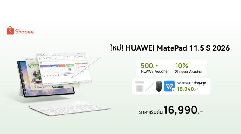 หัวเว่ยร่วมกับ Shopee จัดโปรฯ 2 ต่อ! เป็นเจ้าของแท็บเล็ต HUAWEI MatePad 11.5 S 2026 ในราคาเพียง 16,990 บาท ฟรี! ของแถมมูลค่าสูงสุด 19,339 บาท