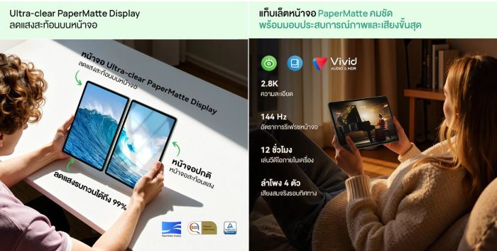 HUAWEI MatePad 11.5 S 2026 โดดเด่นด้วยหน้าจอ Ultra-Clear PaperMatte Display ที่ผลิตด้วยกระบวนการ High-precision Nano-level Etching ลดการกระเจิงของแสงได้ถึง 50% พร้อมมอบผิวสัมผัสเหมือนกระดาษ หน้าจอมีความละเอียดสูง 2800×1840 พิกเซล อัตรารีเฟรช 144Hz, สว่าง 1000 nits รองรับ P3 wide color gamut และ HDR Vivid ควบคู่ไปกับคุณสมบัติถนอมสายตา Anti-Glare, Anti-Reflection และ Anti-Fingerprint สำหรับการสร้างสรรค์