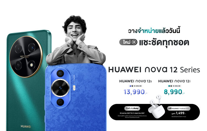 HUAWEI nova 12 Series วางจำหน่ายแล้ววันนี้พร้อมโปรพิเศษสำหรับ HUAWEI nova 12s วางจำหน่ายในราคา 13,990 บาท มาพร้อมตัวเลือก 2 สี คือ Blue และ Black เมื่อสั่งซื้อตั้งแต่วันที่ 3 พฤษภาคม 2567 รับฟรี! HUAWEI FreeBuds SE 2 มูลค่า 1,499 บาท