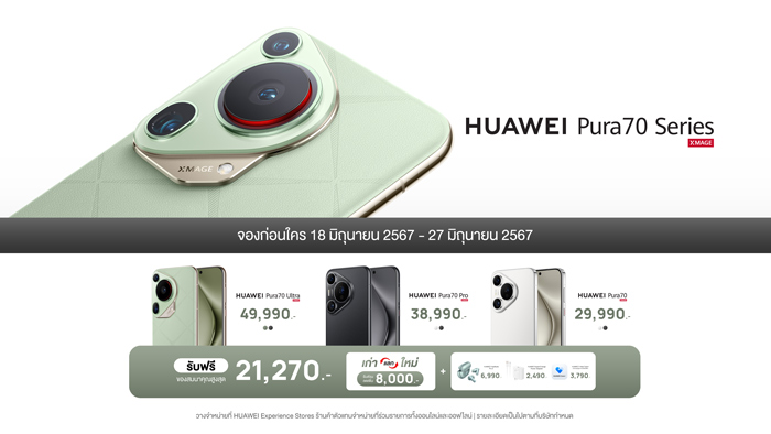 หัวเว่ย คอนซูมเมอร์ บิสสิเนส กรุ๊ป (ประเทศไทย) ประกาศวางจำหน่ายในประเทศไทยพรีออเดอร์แล้ววันนี้สำหรับ HUAWEI Pura 70 Series ในราคาเริ่มต้นเพียง 29,990 บาท สมาร์ทโฟนเรือธงอัดแน่นด้วยคุณภาพด้านการถ่ายภาพผ่านกล้อง Ultra Lighting Pop-out เซ็นเซอร์ขนาด 1 นิ้ว ควบคู่กับกล้องเทเลโฟโต้มาโครผ่านรูรับแสงขนาดใหญ่ F/2.1 พร้อมกันสั่น OIS เติมประสิทธิภาพด้วยฟีเจอร์ Snapshot จับวัตถุเคลื่อนไหวที่ความเร็วสูงสุด 300 กม. ต่อชั่วโมงได้อย่างคมชัด สนุกไปกับแอปพลิเคชันถ่ายภาพ ธนาคาร เกมส์ โซเชียลมีเดียและอื่น ๆ ผ่าน AppGallery