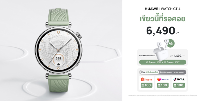 HUAWEI WATCH GT 4 41mm สีเขียวใหม่ วางจำหน่ายในราคา 6,490 บาท เมื่อสั่งซื้อตั้งแต่วันที่ 18 มิถุนายน 2567 – 30 มิถุนายน 2567 รับฟรี HUAWEI FreeBuds SE 2 มูลค่า 1,499 บาท พิเศษ! โปรโมชันออนไลน์เริ่ม 15 มิถุนายน 2567 – 30 มิถุนายน 2567 สำหรับลูกค้าที่ซื้อร้านค้าอย่างเป็นทางการของหัวเว่ยบน Lazada, Shopee และ TikTok รับทันทีคูปองส่วนลด 100 บาท