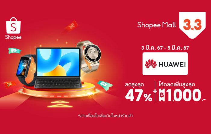 หัวเว่ย คอนซูมเมอร์ บิสสิเนส กรุ๊ป (ประเทศไทย) ร่วมจับมือ ช้อปปี้ อีคอมเมิร์ซเบอร์ 1[1] ครองใจนักช้อปชาวไทย ส่งโปรโมชั่นเปิดดีลลดใหญ่ รับมหกรรมเทศกาลช้อปปิ้งออนไลน์ครั้งแรกของปีในแคมเปญ Shopee 3.3 ลดใหญ่ต้นปี ส่งมอบส่วนลดเกินต้าน ลดสูงสุดกว่า 47% เมื่อสั่งซื้อสินค้าผ่านร้านค้า Huawei Official Store บน Shopee ตั้งแต่วันที่ 3 – 5 มีนาคม 2567 มาดูกันเลยดีกว่าว่ามีอะไรน่าช้อปบ้าง