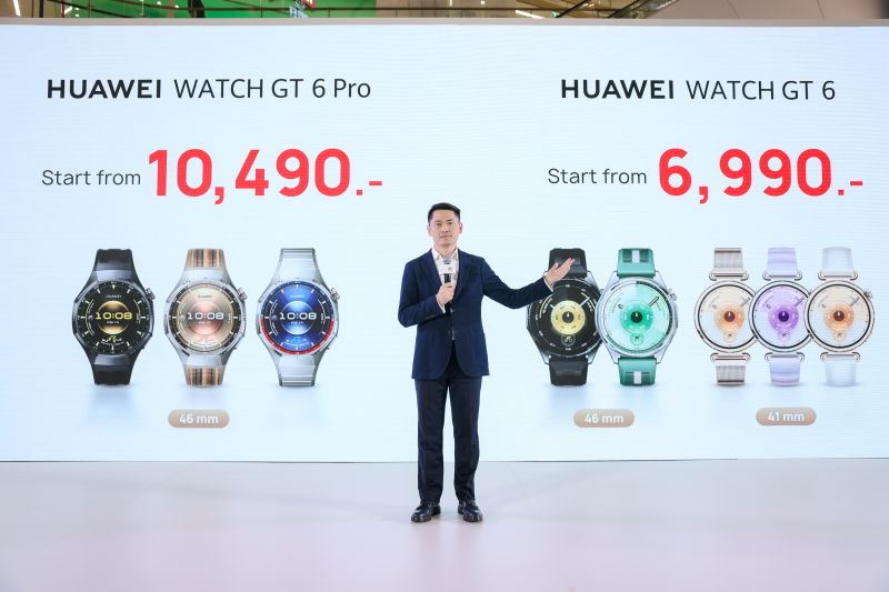 HUAWEI WATCH GT 6 Series วางจำหน่ายอย่างเป็นทางการแล้วในประเทศไทย โดย HUAWEI WATCH GT 6 Pro (46 มม.) ราคาเริ่มต้น 10,490 บาท มีให้เลือกทั้งสีดำ สีน้ำตาล และสีไทเทเนียม ส่วน HUAWEI WATCH GT 6 (46 มม.) ราคาเริ่มต้น 6,990 บาท มาพร้อมสีเขียว และสีดำ และ HUAWEI WATCH GT 6 (41 มม.) ราคาเริ่มต้น 6,990 บาท มีให้เลือกในสีม่วง สีขาวสายหนัง และสีทอง Milanese Gold พิเศษ! เมื่อซื้อระหว่าง 2 ตุลาคม 2568 – 2 พฤศจิกายน 2568 รับของสมนาคุณมูลค่ารวมสูงสุด 8,146 บาท[1] อาทิ HUAWEI FreeBuds 6i (สีขาว) มูลค่า 4,299 บาท, HUAWEI Health+ Membership 3 เดือน มูลค่า 357 บาท และฟีเจอร์กอล์ฟระดับพรีเมียม มูลค่า 3,490 บาท[2] พร้อมประกันภัย ALive Powered by AIA คุ้มครองชีวิตจากการเจ็บป่วยและอุบัติเหตุ 1 ปี สูงสุด 200,000 บาท