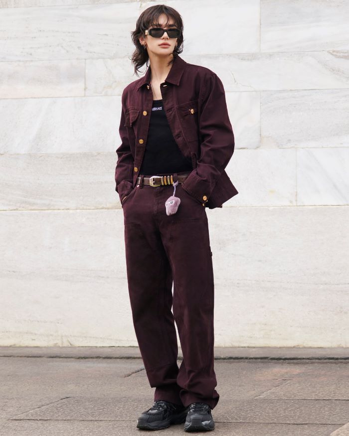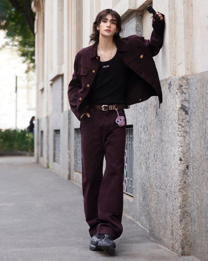 Hyunjin สวมแจ็กเก็ตและกางเกงเข้าชุดสีเบอร์กันดีเข้มจากคอลเลกชั่น Resort 2025 ที่โดดเด่นด้วยกระดุมโลหะสีทองและฮาร์ดแวร์ Medusa Biggie บริเวณกระเป๋าหน้าอกของตัวแจ็กเก็ต ลุคนี้ถูกเติมเต็มด้วย Medusa Fluffy Charm จากคอลเลกชั่นกระเป๋า Versace Tag บริเวณเอวที่เพิ่มความโดดเด่นให้กับลุคนี้อย่างมีเอกลักษณ์