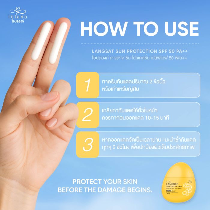 กันแดดยุคใหม่ ต้องไม่ใช่แค่ “กันแดดได้” แต่ต้อง บำรุงลึก ฟื้นฟูผิว และป้องกันผิวแก่ก่อนวัยได้ไปพร้อม ๆ กัน “iblanc Langsat Sun Protection SPF50 PA++” คือตัวอย่างของนวัตกรรมสกินแคร์ที่รวม “Active ระดับเวชสำอาง” กับ “สารกันแดดนำเข้า photostable” ที่ผสมผสานเข้ากันได้อย่างลงตัว เป็นกันแดดที่คิดค้นมาเพื่อทุกสภาพผิว โดยเฉพาะคนเป็นสิวผิวแพ้ง่ายมาก เป็นกันแดดที่ช่วยเสริมเกราะป้องกันผิวให้แข็งแรงขึ้น ไม่แห้งลอก ช่วยให้ผิวทนแดดได้ดี และยังเหมาะกับผู้ที่ใช้ยาแต้มสิวหรือกรดวิตามินเอได้อีกด้วย