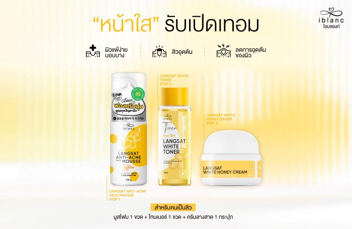 ไอเทมที่แนะนำคนเป็นสิวผิวแพ้ง่าย ครบจบในเช็ตเดียว ประกอบด้วย ไอบลองก์ ลางสาด เฟซ แอนตี้-แอคเน่ มูส ไอบลองก์ ลางสาด ไวท์โทนเนอร์ และ ไอบลองก์ ลางสาด ไวท์ ฮันนี่ ครีม สามารถสั่งซื้อได้ผ่านช่องทางร้านค้าออนไลน์ ได้แก่ Facebook Page: iblanc thailand เพจหลักบริษัท, Instagram: iblancthailand, Tiktok: @iblanc_official, Shopee: iblanc thailand official, Line: @iblancthailand