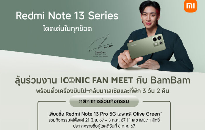 เสียวหมี่มอบสิทธิพิเศษให้ลูกค้าที่ซื้อ Redmi Note 13 Pro 5G สีใหม่ Olive Green ลุ้นร่วมงาน ICONIC FAN MEET กับ BamBam ที่ประเทศมาเลเซีย