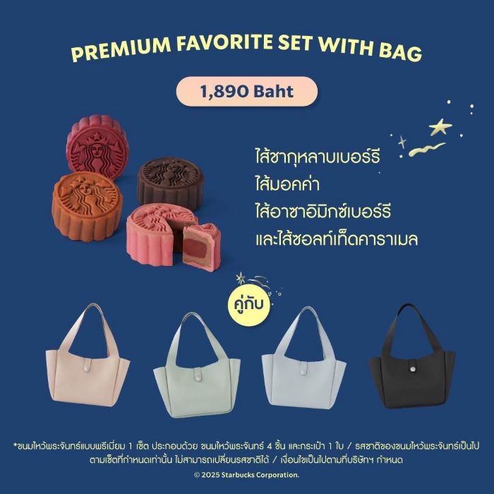 ตามมาด้วย “สตาร์บัคส์” ชั้น 1 และชั้น 7 ที่นำเสนอขนมไหว้พระจันทร์สุดคลาสสิกให้เลือกลิ้มลองทั้งไส้กาแฟสตาร์บัคส์และไข่, ไส้ทุเรียนหมอนทองและไข่, ไส้ชาเขียวสตาร์บัคส์และถั่วแดง และไส้ช็อกโกแล็ตมิ้นท์ เลือกได้แบบ Premium Set 4 ชิ้นพร้อมกระเป๋า 1 ใบ