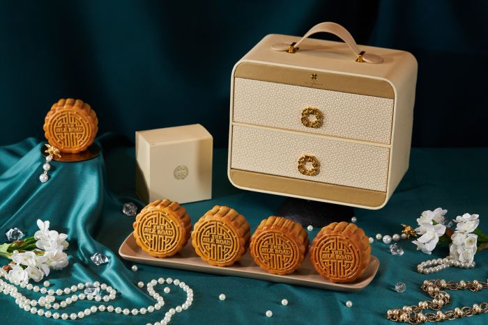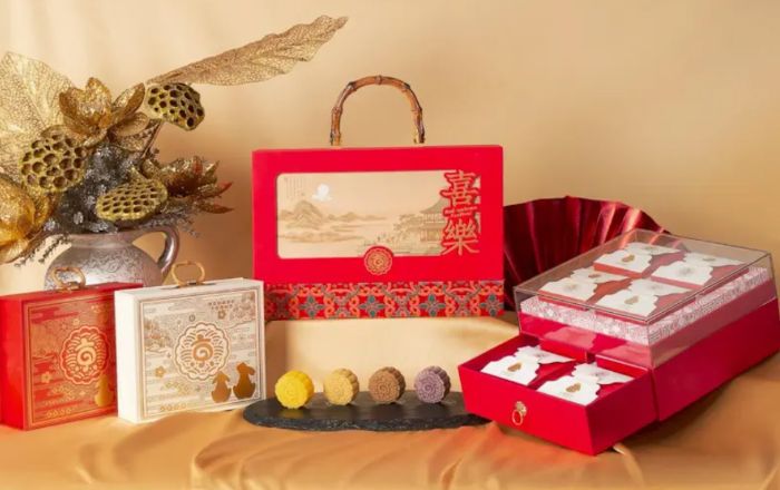 หรือจะสัมผัสความหรูหราที่แฝงไว้ด้วยความหมายอันเป็นสิริมงคลจาก โรงแรมแมนดาริน โอเรียนเต็ล กรุงเทพฯ ที่นำเสนอขนมไหว้พระจันทร์แฮนด์เมดในกล่องหนังวีแกนสีแดงมงคล ตกแต่งด้วยความสง่างามของดอกโบตั๋น เสริมความสิริมงคลด้วยลวดลายสีทอง
