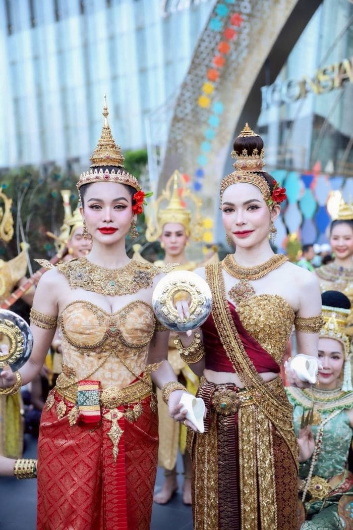 นำขบวนโดย “อิงฟ้า วราหะ” สวยสะกดหยุดลมหายใจ ในชุดเทพธิดาโบราณที่ได้แนวคิดมาจากภาพปฏิมากรรมเทพธิดาโบราณ ภายในวัดพระศรีรัตนศาสดาราม งามสง่าด้วยกรอบถันสลักดุนทองคำบนเกาะอกผ้าไหมสีทอง นุ่งผ้าจีบหน้านางสีแดงจากผ้ายกไหมทอง ศีรษะสวมเกี้ยวมงคลและเกี้ยวยอด เครื่องประดับทองคำแท้โบราณ ซึ่งเป็นของสะสมของ คุณโจ๊ก พุทธพงษ์ เพียรเจริญ นักสะสมเครื่องประดับโบราณ เบอร์ต้นๆ ของไทย โดยมี ผศ.ดร.สุรัตน์ จงดา เป็นผู้ออกแบบเครื่องแต่งกาย ผลงานการออกแบบที่โดดเด่น ได้แก่ มิสไทยแลนด์ยูนิเวิร์ส ภาพยนตร์-ซีรีส์ศรีอโยธยา และละครเรตติ้งท็อปฮิต แม่หยัว โดย “อิงฟ้า” เปล่งประกายประกบคู่ “ชาล็อต ออสติน” เจิดจรัสในชุดไทยประยุกต์ เกาะอกจับเดรปด้วยผ้าไหมไทยสีแดง ผสมปักเลื่อมลูกปัดและดิ้นทอง นุ่งผ้าจีบหน้านางด้วยผ้าไหมยกทอง ศีรษะใส่กรอบหน้าทองประดับอัญมณีทับทิมแท้ ตัวเรือนเป็นทองคำโบราณ เครื่องแต่งกายชุดนี้ออกแบบโดย คุณบิ๊ก – อาจารย์พีรมณฑ์ ชมธวัช และเครื่องประดับที่ชาล็อตสวมใส่ยังเป็นของสะสมชิ้นโปรดของอาจารย์อีกด้วย