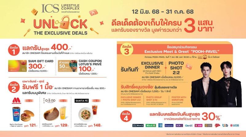ICS Lifestyle Complex ตรงข้ามไอคอนสยาม จัดโปรปังกลางปี “ICS UNLOCK THE EXCLUSIVE DEALS” ดีลเด็ดที่มาพร้อมของรางวัลมูลค่ารวมกว่า 3 แสนบาท ให้ลูกค้าไอซีเอส ช็อปสนุก ได้ครบทุกความสุข ทั้งการเก็บคูปองเงินสด แลก SIAM GIFT CARD อร่อยฟรีกับร้านอาหารชื่อดัง และพิเศษสุดกับการลุ้นร่วมกิจกรรม “EXCLUSIVE DINNER WITH POOH-PAVEL” คู่จิ้นสุดฮอตจาก “Pit Babe The Series” สายช็อป สายกิน และสายฟิน อย่าพลาด ช็อปเก็บดีลเด็ดตั้งแต่วันที่ 12 มิถุนายน 2568 – 31 กรกฎาคม 2568 ที่ ICS Lifestyle Complex