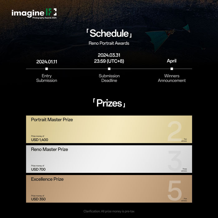 การส่งผลงานเข้าประกวด Imagine IF x Reno Portrait Awards 2024 เริ่มตั้งแต่วันที่ 11 มกราคม ถึง 31 มีนาคม ผลงานที่ส่งเข้าประกวดคาดว่าจะสอดคล้องกับธีม “ถ่ายคนอย่างโปร” โดยสามารถจับภาพวัตถุได้อย่างเป็นธรรมชาติและสมจริงด้วยอารมณ์ที่หลากหลาย การเล่าเรื่องที่ชัดเจนและทรงพลัง