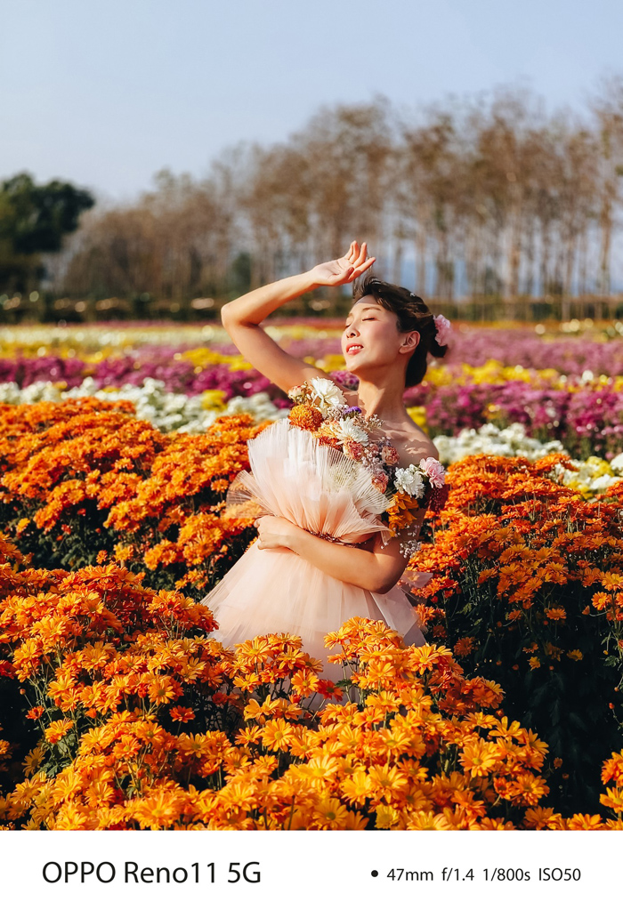 หนึ่งในช่างภาพมืออาชีพที่ได้รับเชิญจาก OPPO ให้จับภาพความงดงามของประเทศไทยคือ Lazy Coup ซึ่งเป็นสื่อด้านการท่องเที่ยวที่ริเริ่มโดยคุณคิม และคุณหนู คู่รักที่หลงใหลในการเดินทาง และสร้างสรรค์อย่างลึกซึ้ง จุดหมายปลายทางล่าสุดที่ช่างภาพทั้งสองคนไปเยี่ยมชมคือจังหวัดนครศรีธรรมราชซึ่งมีสวนเบญจมาศที่ใหญ่ที่สุด มีเบญจมาศกว่า 20 สายพันธุ์ ครอบคลุมพื้นที่กว่า 9,600 ตารางเมตร เพื่อจับภาพแก่นแท้ของบรรยากาศได้อย่างสมบูรณ์แบบ โดย Lazy Coup ได้ใช้ฟีเจอร์ Portrait Mode 2x ของ OPPO Reno11 Series 5G ซึ่งไม่เพียงแต่ซูมเข้าไปยังวัตถุเท่านั้น แต่ยังฉายแสงสปอตไลต์ และให้ภาพที่ถ่ายในช่วงเวลาพลบค่ำอีกด้วย