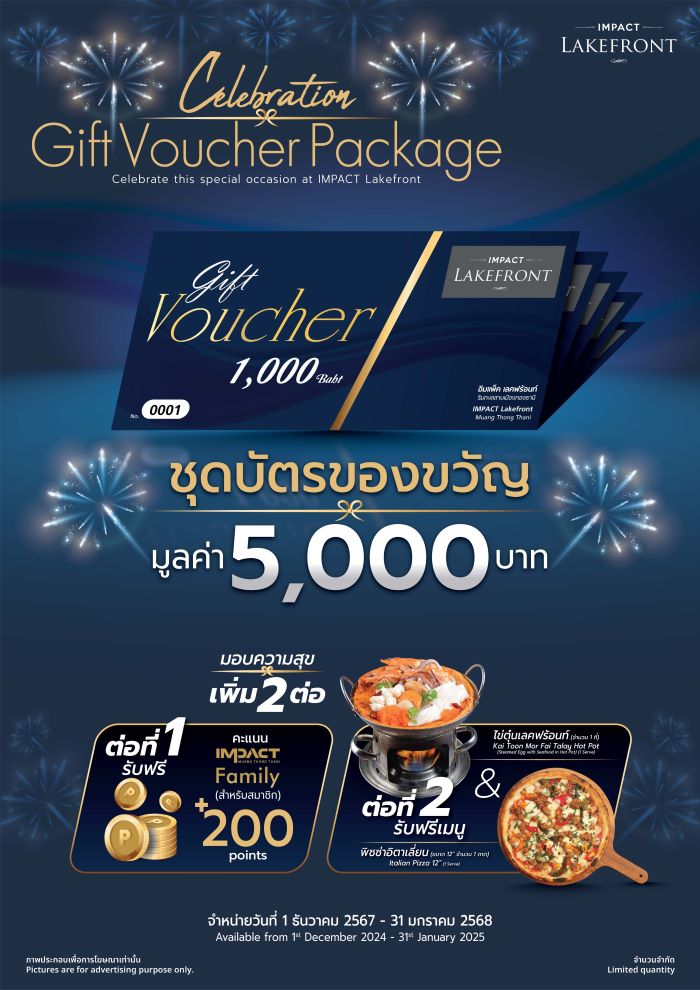 นึกถึงบัตรกำนัลเงินสดแทนค่าความรัก ด้วยความอร่อยที่มีคุณภาพและความน่าเชื่อถือ ห้ามพลาดมาเลือกช็อปบัตรกำนัลเงินสด จาก 5 ร้านอาหารเครืออิมแพ็ค เริ่มที่ ร้านที่ 1 “อิมแพ็คเลคฟร้อนท์” ร้านอาหารริมทะเลสาบที่ใหญ่ที่สุดในจังหวัดนนทบุรี มอบความคุ้มค่าด้วยบัตรกำนัลเงินสด มูลค่า 5,000 บาท (ใบละ 1,000 บาทจำนวน 5 ใบ) รับฟรี! ต่อที่ 1. เมนูอาหารซิกเนเจอร์ เมนู”ไข่ตุ๋นเลคฟร้อนท์” 1 ที่ (มูลค่า 650 บาท) และยังมี “พิซซ่าอิตาเลี่ยน” ขนาด 12 นิ้ว 1 ถาด (มูลค่า 370 บาท) และต่อที่ 2. พร้อมรับคะแนน “อิมแพ็คแฟมิลี่” 200 คะแนน เมื่อซื้อบัตรกำนัลเงินสด