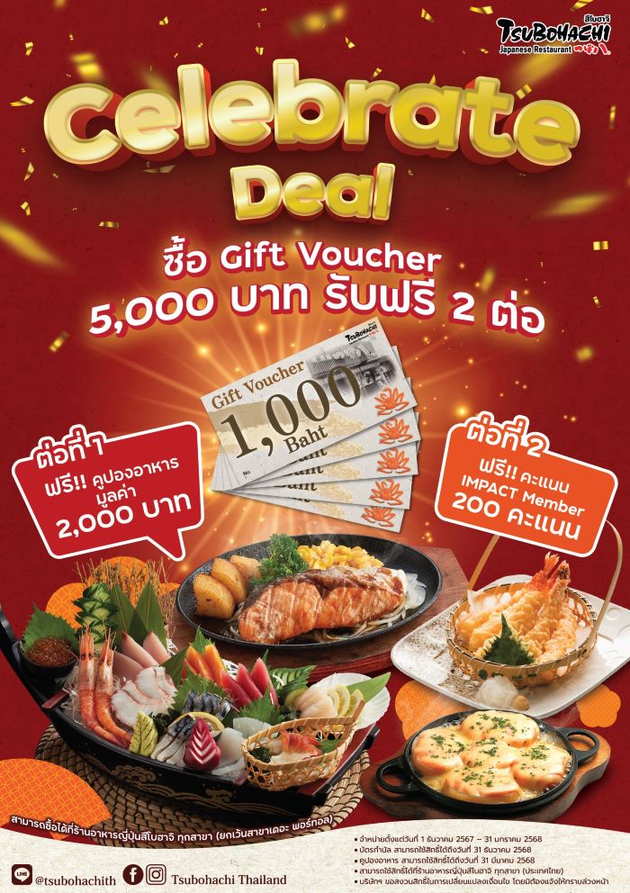 ส่วนคนรักอาหารญี่ปุ่น ต้องไม่พลาดร้านที่ 4 กับ “สึโบฮาจิ” ร้านอาหารญี่ปุ่นอิซากายะต้นตำรับอันดับ 1 จากเมืองฮอกไกโด ประเทศญี่ปุ่น ชวนคุณเลือกช็อปบัตรกำนัลมูลค่า 5,000 บาท (ใบละ 500 บาท จำนวน 4 ใบ และใบละ 1,000 บาท จำนวน 3 ใบ) รับฟรี 2 ต่อ กับ Celebrate Deal จัดเสิร์ฟความคุ้มค่าส่งท้ายปี ต่อที่ 1 : รับฟรี! คูปองอาหารพิเศษ 4 เมนู (จำนวน 4 ใบ) เมนูละ 1 ใบ มูลค่า 2,000 บาท ประกอบด้วยเมนูแสนอร่อย ได้แก่ “มันฝรั่งราดซอสไข่ปลาเมนไท”, “ปลาแซลมอนเทอริยากิ”, “กุ้งเทมปุระ” และ “ปลาดิบรวมพิเศษ” ต่อที่ 2 : รับฟรี! คะแนน “อิมแพ็คแฟมิลี่” 200 คะแนน