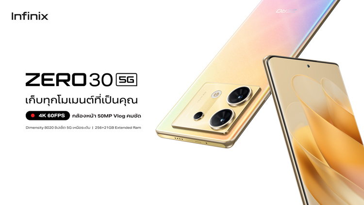 อินฟินิกซ์ (Infinix) แบรนด์สมาร์ตโฟนราคาคุ้มค่า ครบครันทุกการใช้งาน และตอบโจทย์ไลฟ์สไตล์คนรุ่นใหม่ เตรียมเปิดตัวสมาร์ตโฟนสายกล้องระดับพรีเมียมรุ่นใหม่ล่าสุด Infinix ZERO 30 5G กับสโลแกน “Capture Your Own Story – เก็บทุกโมเมนต์ที่เป็นคุณ” พร้อมชูจุดขายเป็นสมาร์ตโฟนรุ่นแรกในตลาดราคากลางที่มาพร้อมกล้องหน้า 4K รองรับการถ่ายวิดีโอสูงสุดถึง 60FPS เพื่อมอบประสบการณ์การครีเอทคอนเทนต์ที่เหนือกว่า ในช่วงเรทราคาไม่เกิน 12,000 บาท พร้อมผสานกับชิปเซ็ต 5G ทรงพลัง MediaTek Dimensity 8020 มาพร้อมหน้าจอ 3D Curved AMOLED ที่ให้ภาพคมชัดสวยสมจริง และอัตราการรีเฟรชที่ 144Hz เพื่อรองรับการใช้งานได้อย่างเต็มประสิทธิภาพ ตอบโจทย์ด้านความบันเทิงให้แก่ผู้ใช้งานและสร้างแรงบันดาลใจให้คนรุ่นใหม่ผ่านเลนส์กล้องของ Infinix ZERO 30 5G ได้อย่างลงตัว