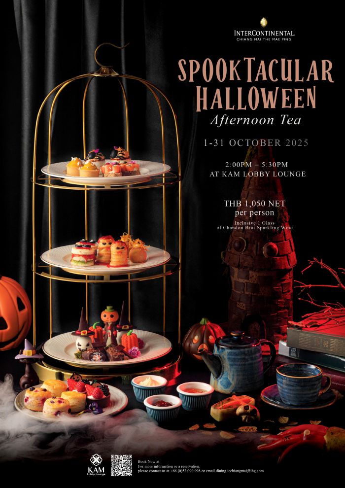 สำหรับวันที่ 1-31 ตุลาคม ร่วมฉลองเทศกาลฮาโลวีนด้วยชุดน้ำชายามบ่าย Spooktacular Halloween Afternoon Tea ที่ คำ ล็อบบี้ เลานจ์ (KAM Lobby Lounge) ลิ้มรสขนมหวานและของว่างในธีมสุดเก๋ พร้อมจิบชาพรีเมียมและสปาร์กลิงไวน์ Chandon Brut หนึ่งแก้ว ในราคา 1,050 บาทสุทธิต่อท่าน เพลิดเพลินกับขนมแสนอร่อย อาทิ เดวิลส์อายแซนด์วิชไข่, โทสต์แซลมอนรมควัน ทิรามิสุโลงศพ ช็อกโกแลตกะโหลก ทาร์ตเบอร์รี่เลือด และสโคนอบสดใหม่