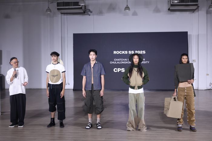ชาติชาย ศรีเพิ่มพันธ์ คณะศิลปกรรมศาสตร์ สาขาวิชานฤมิตศิลป์ เอกแฟชั่นและสิ่งทอ จุฬาลงกรณ์มหาวิทยาลัย ได้นำเสนอเรื่องราวและ Identity ของแบรนด์ CPS Chaps ในคอลเลกชั่น “ROCKS ss 2025” โดยตีความคำว่า “Rock” เป็นสิ่งที่เรียบง่าย เป็นได้ทั้งดนตรีและธรรมชาติ โดยนำมาเล่าผ่านการออกแบบแบบ Modular Design เพื่อนำเสนอรูปแบบเสื้อผ้าที่สามารถปรับเปลี่ยนได้สำหรับผู้สวมใส่ และเป็นหนึ่งในทางเลือกใหม่สำหรับอนาคต เพื่อสร้างความยั่งยืนในอุตสาหกรรมแฟชั่น นอกจากนี้ยังได้เลือกใช้ผ้า Denim ที่มีความทนทานสำหรับ Workwear มาใช้ เพื่อสื่อให้เห็นถึงผ้าที่ถูกนำมารีไซเคิลใหม่ ก็สามารถสร้างความแปลกใหม่ได้