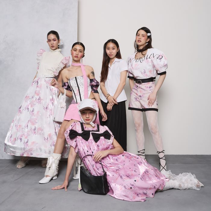 มาย พฤกษากิจเจริญ คณะศิลปกรรมศาสตร์ สาขาวิชาศิลปะการออกแบบพัสตราภรณ์ เอกแฟชั่นดีไซน์ มหาวิทยาลัยธรรมศาสตร์ สร้างสรรค์คอลเลกชั่น “Infinite Bloom การเบ่งบานไร้สิ้นสุด” สำหรับแบรนด์ Lyn Around โดยได้รับแรงบันดาลใจมาจาก Aganisia Cyanea Orchid หรือดอกกล้วยไม้สีหายาก บางสายพันธุ์นี้ให้ดอกสีม่วงอมน้ำเงิน กล้วยไม้ชนิดนี้เปรียบเหมือนเด็กรุ่นใหม่ โดยเริ่มต้นการออกแบบจากการศึกษาเทรนด์จาก WGSN ที่กำลังมาแรง ทั้งเรื่องของวัสดุ สี เทกเจอร์ จนมาลงตัวที่ผ้าที่สวมใส่ง่ายอย่าง Cotton 100% Cotton twill และผ้า Organdy เป็นผ้าหลักในการทำคอลเลกชั่น และนำมาปริ้นท์ลวดลายดอกกล้วยไม้และดีไซน์เป็นชุดต่อไป
