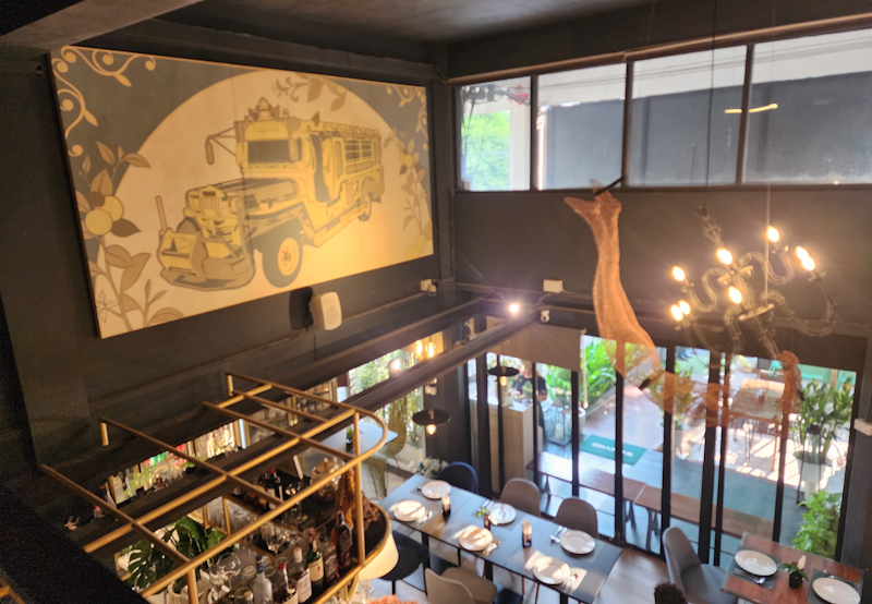 บรรยากาศร้านตกแต่งให้นั่งสบาย ด้วยกลิ่นอายของความเป็นฟิบิโนสไตล์ ผนังห้องด้านขวามือ ประดับด้วยภาพวาดสัตว์และรถบรรทุก อันเป็นเอกลักษณ์ของชาวฟิลิปปินส์