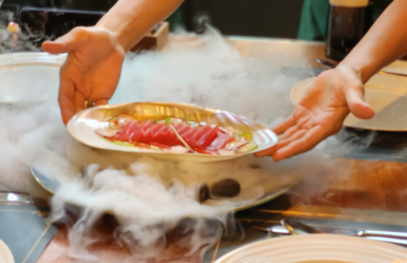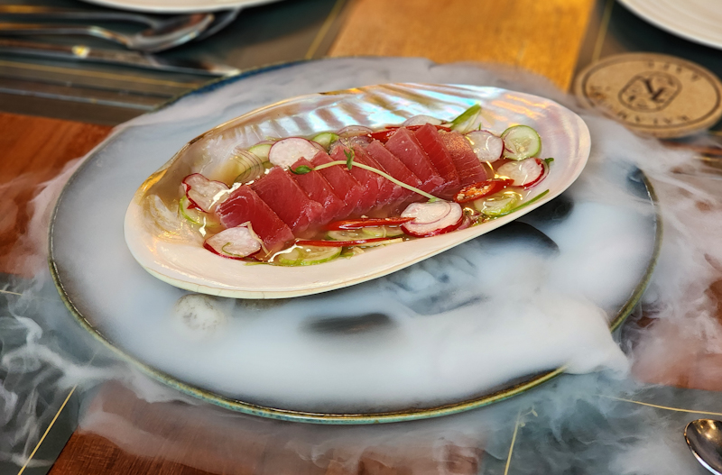 ถัดมาเป็น Tuna Kinilaw หรือยำทูน่าเกรดซาชิมิ สวยสะดุดตากับทูน่าเนื้อแดงที่เสิร์ฟมาอย่างชวนว้าว รับประทานคู่กับเครื่องเคียงผักสดให้ความสดชื่น