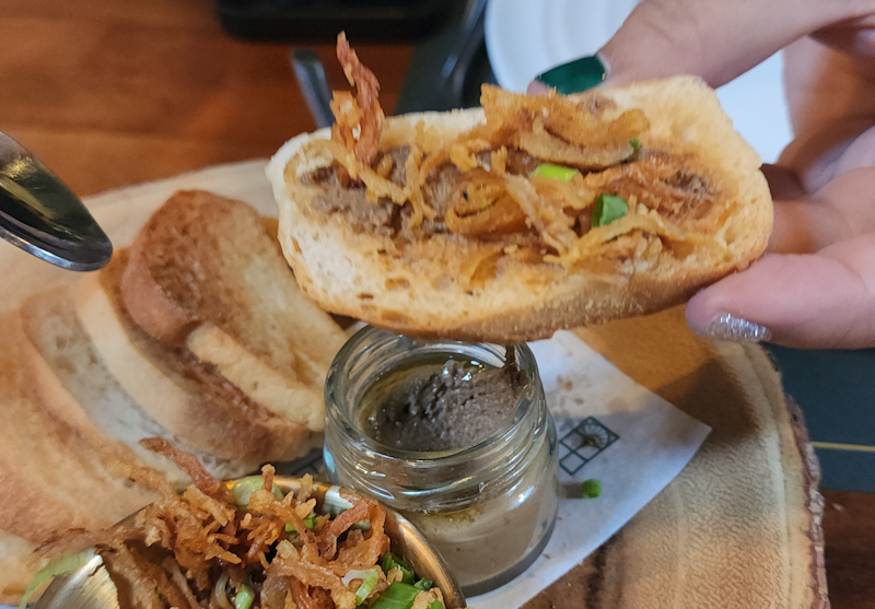 เริ่มจากเมนูเรียกน้ำย่อยที่ทางร้านรังสรรค์ขึ้นมาเอง Complimentary Toasted Pandesal with Adobo Flakes เป็นขนมปังเนยทานคู่กับเครื่องเคียงคือสตูว์ตับไก่ และไก่หยอง