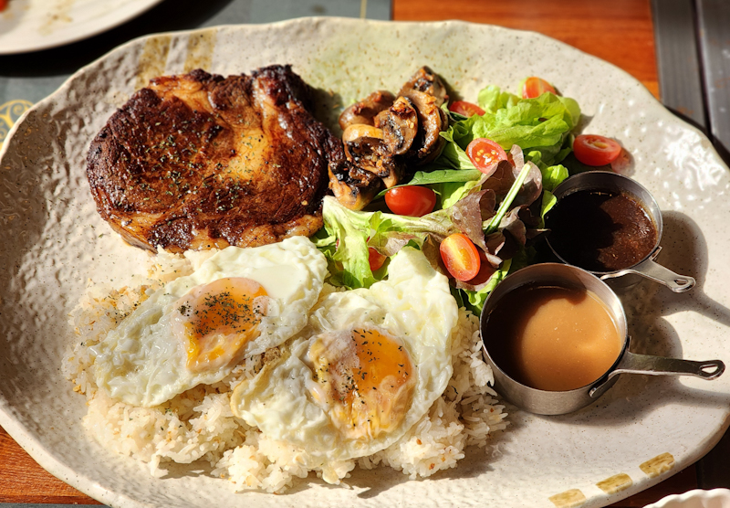 ส่วนใครชอบเนื้อวัวต้องลอง Rib Eye 80z เนื้อนิวซีแลนด์รีบอาย ทานคู่กับข้าวผัดหรือข้าวกระเทียม โดยมีแบบปกติและแบบที่เสิร์ฟฟร้อมเกรวี่ หรือ ไข่ 2 ฟอง
