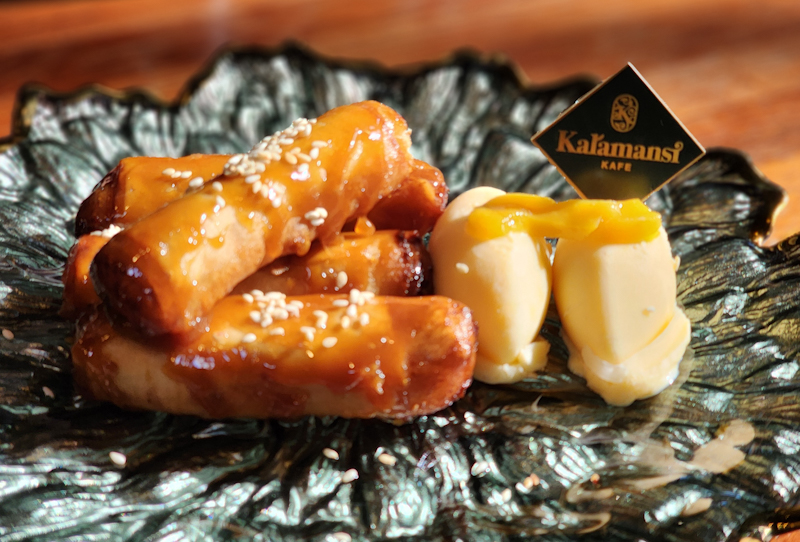 Turon with Langka ice cream กล้วยหินทอด และขนุนเคลือบคาราเมล โรยด้วยงาคั่ว ทานคู่กับไอศกรีมขนุน