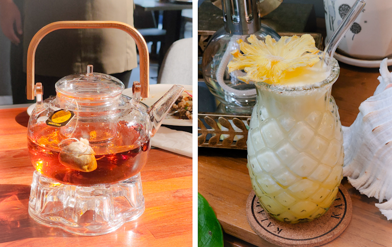 ชาร้อนที่จิบพร้อมของหวาน และเครื่องดื่ม PINYA COLADA รสชาติละมุนจากส่วนผสมของเหล้ารัมมะพร้าว น้ำกะทิ และสับปะรดสด