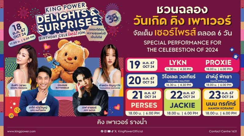 คิง เพาเวอร์ ครบรอบ 35 ปี จัดงานเฉลิมฉลองสุดยิ่งใหญ่ KING POWER DELIGHTS AND SURPRISES “BIRTHDAY CELEBESTION ฉลองได้สุด ความสุขแห่งปี เป็นไปได้” พบกับความบันเทิงจากทัพศิลปินชื่อดัง นำโดย น้องเนย – อาโป ร่วมส่งมอบความสุขแบบเต็มอิ่ม และโปรโมชันที่ดีที่สุดแห่งปีเซอร์ไพรส์ให้สุดกับอีเวนต์ใหญ่ที่ทุกคนรอคอย ตลอด 6 วันเต็ม ตั้งแต่วันที่ 18 – 23 ตุลาคมนี้ ที่ คิง เพาเวอร์ รางน้ำ