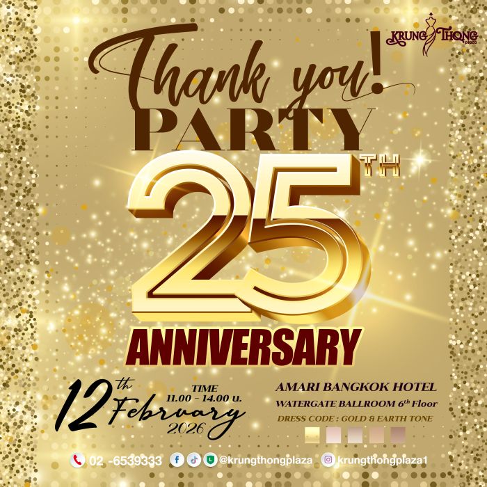 ห้างกรุงทองพลาซา ศูนย์ค้าส่งเสื้อผ้าพลัสไซส์ที่ใหญ่ที่สุดในประเทศไทย ประกาศความสำเร็จครั้งยิ่งใหญ่ในโอกาสครบรอบ 25 ปี เตรียมจัดงาน “Krungthong Plaza Thank You Party 25th Anniversary” เพื่อตอบแทนคำขอบคุณลูกค้า พันธมิตรทางธุรกิจ และผู้สนับสนุนที่อยู่เคียงข้างกันมาอย่างยาวนานในเดือนแห่งความรัก วันที่ 12 กุมภาพันธ์นี้ ณ โรงแรมอมารี กรุงเทพ