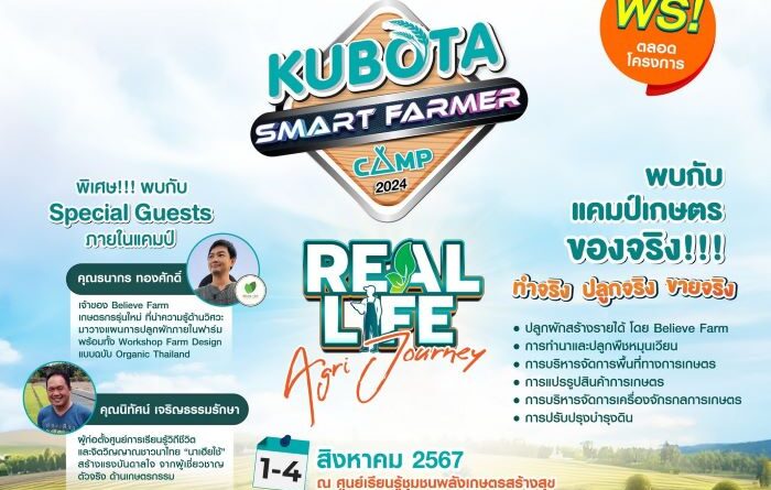 กลับมาอีกครั้ง!! กับที่สุดของแคมป์เกษตรแห่งปี “KUBOTA Smart Farmer Camp 2024” จัดโดยบริษัทสยามคูโบต้าคอร์ปอเรชั่น จำกัด มาในธีม “Real-Life Agri Journey” จากพื้นที่การเรียนรู้ สู่วิถีชีวิตจริง พร้อมจุดประกายเยาวชนรุ่นใหม่พร้อมนำประสบการณ์กลับไปใช้พัฒนาวิถีการทำการเกษตรของในแบบของตัวเอง ผ่านการเรียนรู้นวัตกรรมเกษตร Smart Farming จากเกษตรกรต้นแบบตัวจริง ณ ศูนย์เรียนรู้ชุมชนพลังเกษตรสร้างสุขสยามคูโบต้า-หนองผักบุ้ง จ.เพชรบูรณ์ พร้อมกันนี้ยังมีกูรูด้านเกษตรรับเชิญ คุณนิทัศน์ เจริญธรรมรักษา และคุณหนึ่ง ธนากร ทองศักดิ์ เจ้าของ Believe Farm ร่วมถ่ายทอดประสบการณ์ด้านการทำเกษตรอินทรีย์ พร้อมยังได้สนุกกับเวิร์กชอปเสริมทักษะออนไลน์ต่อยอดสู่การเป็นนักธุรกิจเกษตร