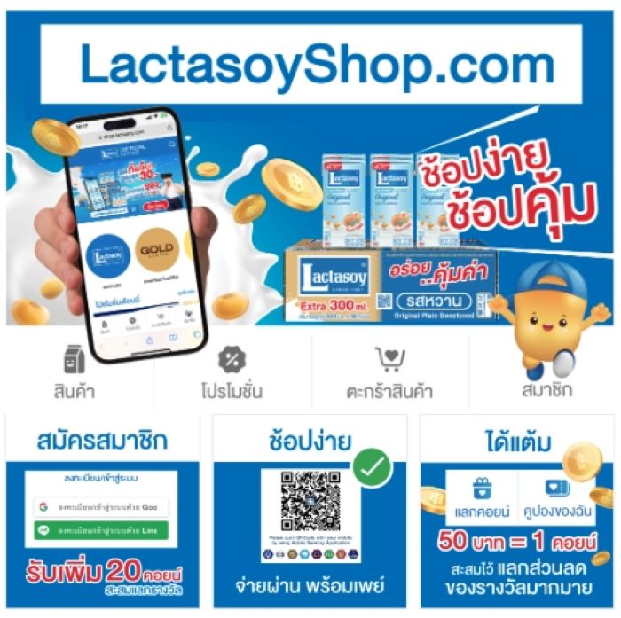 แลคตาซอย นมถั่วเหลืองแบรนด์ครองใจผู้บริโภค ขอแนะนำโฉมใหม่เว็บ Lactasoyshop.com ที่อ่านง่ายสบายตา ให้ช้อปกันง่ายๆ ส่งท้ายปี พร้อมสะสมแต้มแลกของรางวัลพิเศษมากมาย ดังนี้