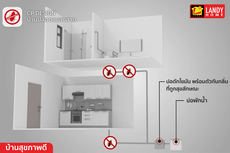 CP Design นวัตกรรมบ้านปลอดแมลงสาบ ตอบโจทย์ผู้อยู่อาศัยใส่ใจสุขอนามัย แก้ปัญหาแมลงสาบซึ่งเป็นปัญหาใหญ่ของคนมีบ้าน แลนดี้ โฮม จึงพัฒนานวัตกรรมที่อยู่อาศัยเพื่อแก้ปัญหาป้องกันไม่ให้แมลงรบกวนภายในบ้านได้อย่างยั่งยืน ด้วยการตัดเส้นทางการเข้าออกและวงจรชีวิตของแมลงสาบ โดยไม่ใช้สารเคมี เพื่อความปลอดภัยของผู้อยู่อาศัย จึงเน้นในเรื่องวิธีการจัดการระบบสุขาภิบาลรอบบ้านที่ทันสมัย ด้วยการสร้างบ่อดักไขมันพร้อมตัวกันกลิ่นที่ถูกสุขลักษณะ เลือกใช้ ประตูครัว Galvanized Seal ขอบยางโดยรอบ เพื่อให้ผู้อยู่อาศัยมีสุขอนามัยที่ดี
